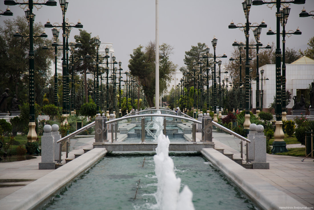 Помимо домов из белого мрамора, в городе очень много памятников и скульптур. По большей части, конечно, памятники пожизненному президенту Туркменбаши (всего по Туркменистану около 14 000), но есть и другие. Как правило, монументы чёрные или золотые. Смотрятся эффектно, но фотографировать большинство из них запрещено. Солдаты и милиция сразу показывают знак запрета, перекрестив руки на уровне лица.