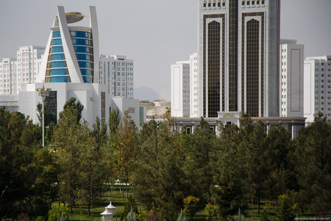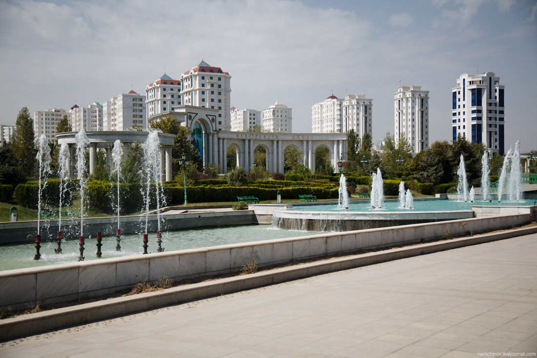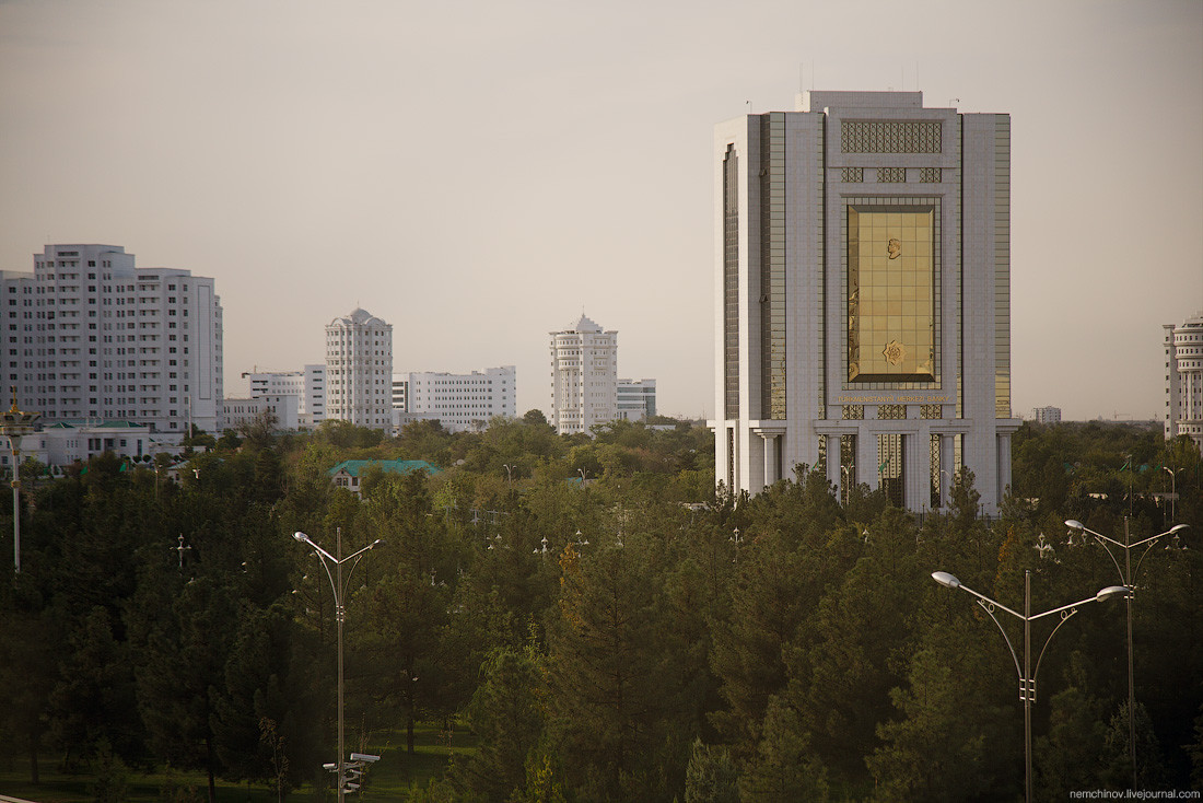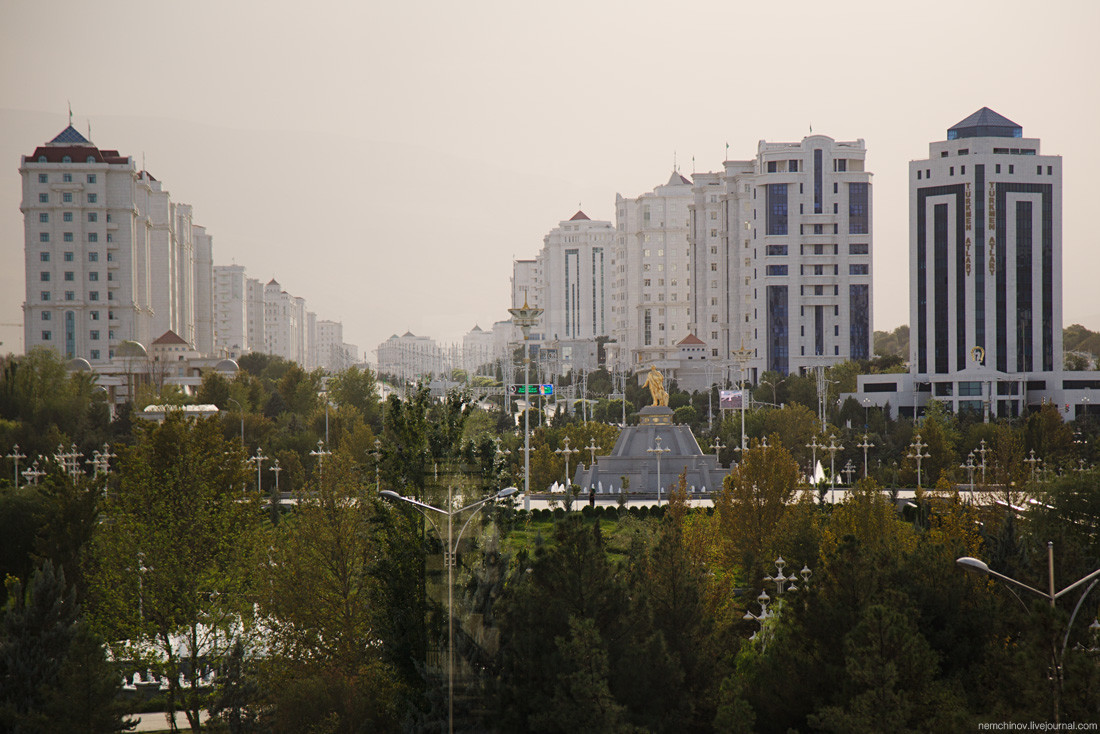 Когда смотришь на зелёные массивы Ашхабада, трудно поверить, что это один из самых жарких городов в мире. Я помню, как престарелый таксист вёз меня в аэропорт и рассуждал о том, что не понимает, как здесь раньше жили люди без кондиционеров в машинах, ведь температура летом выше 60 градусов! Наверняка преувеличивал, но что летом температура поднимается выше 45 градусов - это точно. Во время моего недавнего визита температура днём не опускалась ниже 35.