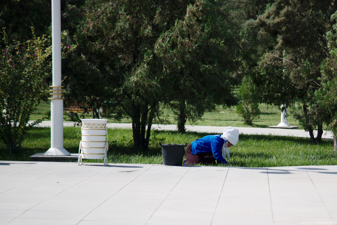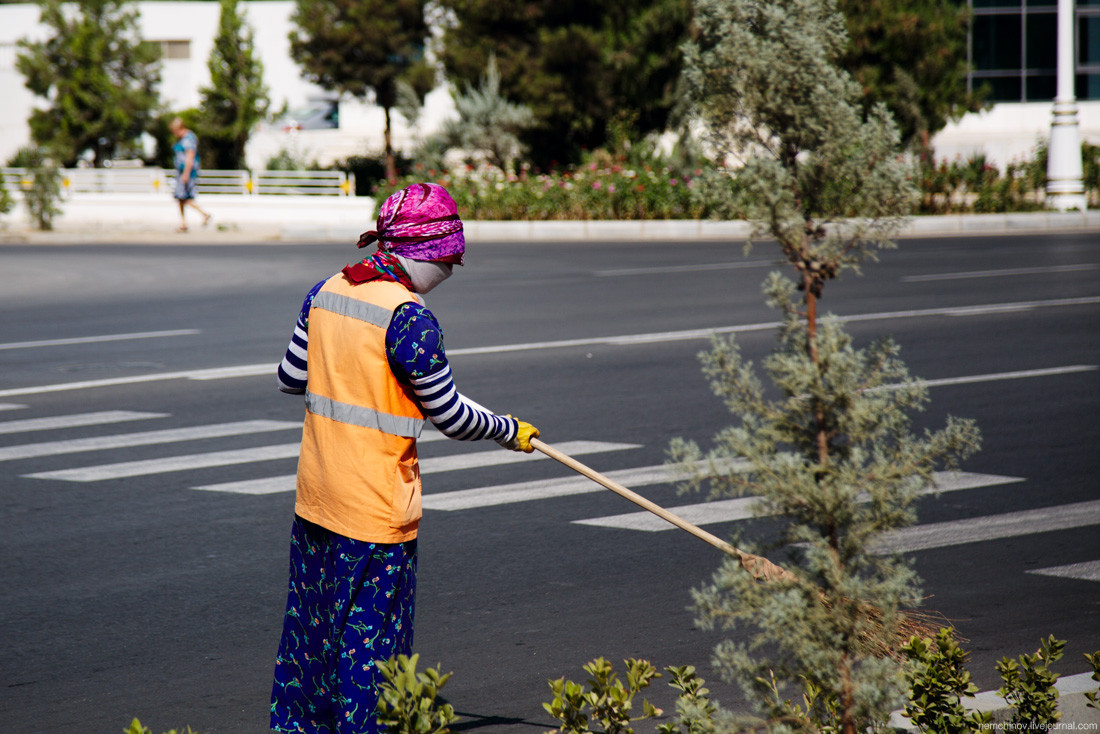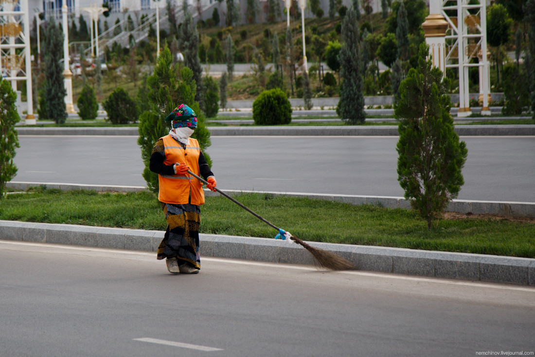Отличительная черта дворников в Ашхабаде - закрытые лица. Они не скрываются, это вынужденная мера: слишком много песка и пыли, легкие нужно хоть как-то защищать.