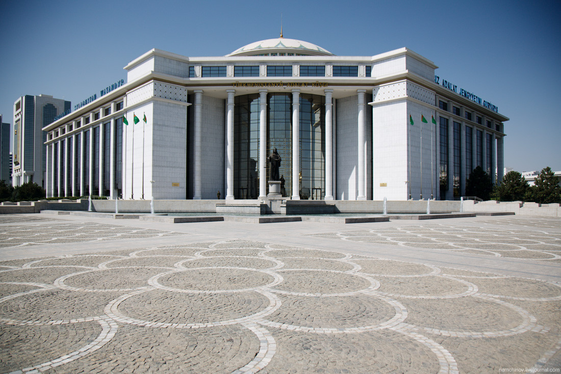 Я слышал от местных, что нынешний президент время от времени пролетает над Ашхабадом на вертолёте и решает, где построить новую аллею или вместо какого старого жилого массива протянуть новую улицу. Это министерство адалат (юстиции).
