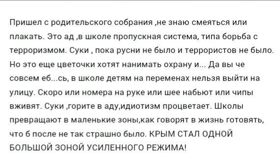 3. В Крыму школа становится мини-зоной, а учителя — прямыми пособниками оккупационного режима! Пришёл с родительского собрания. Не знаю, смеяться или плакать. Это ад! В школе пропускная система — типа борьба с терроризмом. Суки! Пока русни не было — и террористов не было. Но это ещё цветочки. Хотят нанимать охрану и… в школе детям на переменах нельзя выйти на улицу. Скоро или номера на руке/шее набьют, или чипы вживят. Идиотизм процветает. Горите в аду! Школы превращают в маленькие зоны, как говорят, “в жизнь готовят”, чтоб после — не так страшно было. Крым стал одной большой зоной усиленного режима.