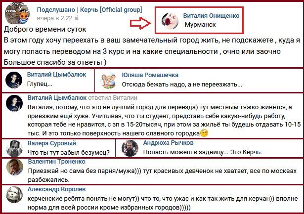 5. В Керчь из Мурманска очередные понаехавшие пробиваются: “В этом году хочу переехать в ваш замечательный город жить. Куда я могу попасть переводом на 3 курс и на какие специальности — очно или заочно?”. Ответы: “Отсюда бежать надо, а не переезжать”, “Тут местным тяжко живётся, а приезжим ещё хуже. Представь себе какую-нибудь работу, которая тебе не нравится, с зарплатой в 15-20 тысяч, при этом за жильё ты будешь отдавать 10-15 тысяч. И это только поверхность нашего славного городка”, “Что ты тут забыл, безумец?”, “Попасть можешь в задницу. Это Керчь”, “Приезжай, но сама (выяснилось, что писала деваха из Мурманска), без парня/мужа. Тут красивых девчонок не хватает, все по москвах разбежались”, “Керченские ребята понять не могут, что то, что ужас, — вполне норма для всей россии, кроме избранных городов”.