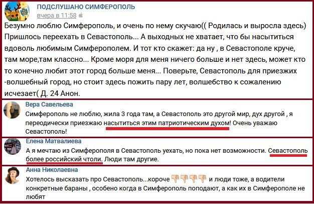 7. Совок, а теперь и россия, сделали из Севастополя идол фейковой “русской славы”, поэтому самые упоротые совки и съезжаются в город, делая ещё более невыносимым существование тех, кто не потерял связь с реальностью: “Безумно люблю Симферополь, и очень по нему скучаю. Поверьте, Севастополь для приезжих — волшебный город, но стоит здесь пожить пару лет, волшебство, к сожалению, исчезает”, “Симферополь не люблю, жила 3 года там, а Севастополь — это другой мир, дух другой. Я периодически приезжаю насытиться этим патриотическим духом! Очень уважаю Севастополь!”, “А я мечтаю из Симферополя в Севастополь уехать, но пока нет возможности. Севастополь более российский, что ли. Люди там другие”.