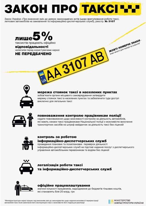 Також однією з ініціатив Міністерства інфраструктури та Національної поліції є запровадження вимоги щодо необхідності отримання жовтих номерних знаків тим підприємцям, які легально працюють на ринку таксі, для можливості їх ідентифікації контролюючими службами та безпосередньо самими клієнтами.