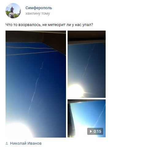 1. “Зато не стреляют”. В разных районах Симферополя около 16:00 жители услышали громкий взрыв. На центральных улицах тряслись окна, почувствовалась ударная волна и сработали сигнализации на машинах. После взрыва (многие слышали 2 хлопка) в небе остался белый инверсионный след, как от запуска ракеты (ПЗРК) или боевого самолета (многие его видели). Некоторые симферопольцы высказывают предположение, что причиной звука мог стать военный самолет оккупантов, который над городом перешёл на сверхзвуковую скорость, что делать над жилыми домами запрещено. Оккупанты не комментируют ситуацию