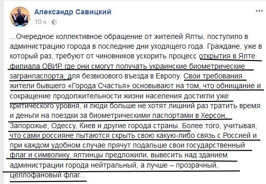 6. Ялтинский ватник троллит оккупантов, чьи спортсмены поедут на Олимпиаду под флагом страны-404. Но в этом троллинге много правды: “Очередное коллективное обращение от жителей Ялты поступило в администрацию города в последние дни уходящего года. Граждане уже в который раз требуют от чиновников ускорить процесс открытия в Ялте филиала ОВИР, где они смогут получать украинские биометрические загранпаспорта для безвизового въезда в Европу. Свои требования жители бывшего “Города счастья” основывают на том, что обнищание и сокращение продолжительности жизни населения достигли уже критического уровня, и люди больше не хотят лишний раз тратить время и деньги на поездки за биометрическими паспортами в Херсон, Запорожье, Одессу, Киев и другие города страны. Более того, учитывая, что сами россияне пытаются скрыть свою какую-либо связь с россией, и при каждом удобном случае прячут подальше свои государственный флаг и символику, ялтинцы предложили вывесить над зданием администрации города нейтральный, а лучше — прозрачный целлофановый пакет”