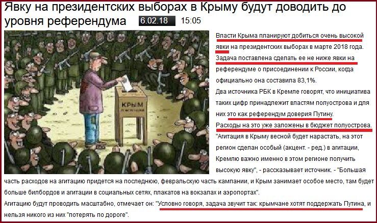 12. Источники российских пропагандонов из РБК сообщили, что явку на “выборах” путина в Крыму нарисуют, как и на оккупендуме: “Власти Крыма планируют добиться очень высокой явки на президентских выборах в марте 2018 года. Задача поставлена сделать ее не ниже явки на референдуме о присоединении к россии. Расходы на это уже заложены в бюджет полуострова. Агитацию будут проводить масштабно. Условно говоря, задача звучит так: крымчане хотят поддержать путина, и нельзя никого из них потерять по дороге”