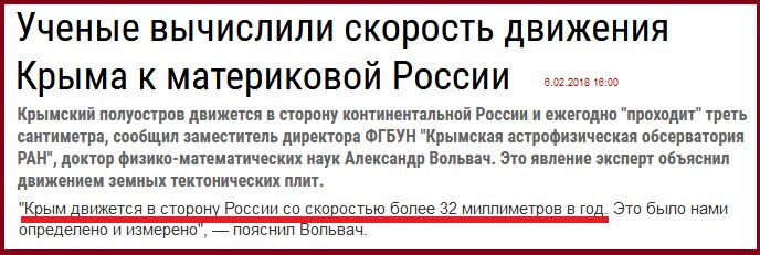 8. Срочная новость! Российские ученые определили, что “Крым движется в сторону россии со скоростью более 32 миллиметров в год”, что, по версии пропагандонов, является “третью сантиметра”. Мост можно не строить, просто надо чуть-чуть подождать. Зато уровень жизни до российского опустили значительно быстрей. Тут никакой мост не поможет, а наоборот, только усугубит ситуацию