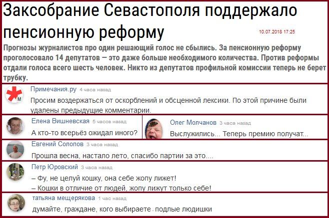 1. Т.н. “Заксобрание” Севастополя поддержало пенсионную реформу. Ватники в таком диком восторге откомментировали новость, что пропагандоны бросились чистить комментарии. Заскринить самый смак не успел: “Просим воздержаться от оскорблений и обсценной лексики. По этой причине были удалены предыдущие комментарии”, “А кто-то всерьёз ожидал иного?”, “Выслужились. Теперь премию получат”, “Прошла весна, настало лето, спасибо партии за это”, “ — Фу, не целуй кошку, она себе жопу лижет! Кошки, в отличие от людей, жопу лижут только себе!”, “Думайте, граждане, кого выбираете. Подлые людишки”.