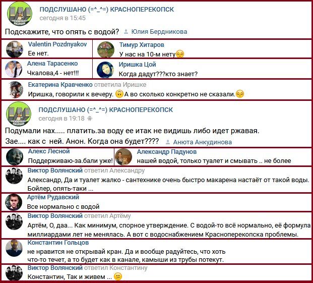 7. Жители Яны-Капу (Красноперекопска) задают глупые вопросы про воду, а некоторые предлагают радоваться и тому, что есть: “Что опять с водой?”. Ответы: “Её нет”, “Когда дадут???”, “Говорили, к вечеру”, “Нах платить за воду? Ее и так не видишь, либо идет ржавая. Зае… как с ней. Анон. Когда она будет????”, “Поддерживаю, за*бали уже!”, “Нашей водой только туалет и смывать, не более”, “Да и туалет жалко — сантехнике очень быстро макарена настаёт от такой воды. Бойлер, опять-таки”, “Все нормально с водой”, “С водой-то всё нормально, её формула миллиардами лет не менялась. А вот с водоснабжением Красноперекопска проблемы”, “Не нравится — не открывай кран. Да и вообще, радуйтесь, что хоть что-то течет, а то будет, как в канале, — камыши из трубы потекут”, “Так и живем”.