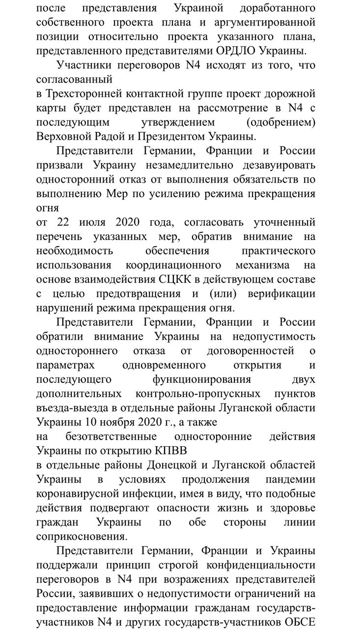 "Ниже – проект совместного заявления по итогам видеоконференции советников N4, которая состоялась 13 ноября, – отметил Розенбаум. – Данный проект заявления был направлен на согласование в Нормандский формат российской стороной и сопровождался электронным письмом Дмитрия Козака, в котором выражается удивление тем, насколько украинский вариант итогового заявления отличается от текста, который был реально согласован всеми сторонами переговоров. Для понимания происходящего привожу весь текст целиком (перевод с английского):