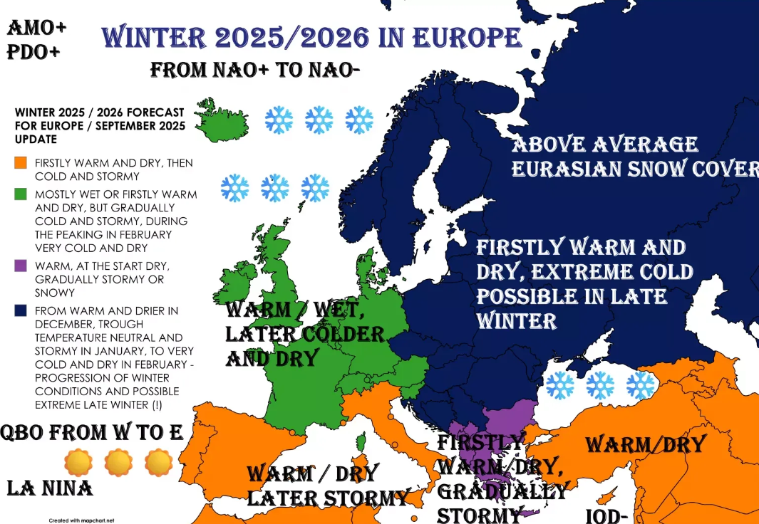 Фахівці наголошують, що зима 2025-2026 обіцяє стати однією з найбільш непередбачуваних за останні роки — від штормового та вологого початку грудня до значних лютневих холодів. Європі слід готуватися до нестабільного та холодного зимового сезону.