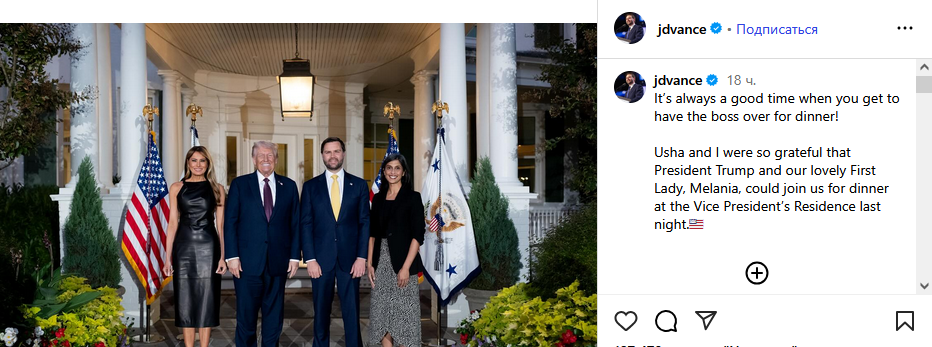 «Завжди приємно, коли бос приходить до тебе на вечерю! Уша і я були дуже вдячні, що президент Трамп і наша чарівна перша леді Меланія змогли приєднатися до нас на вечері у резиденції віцепрезидента вчора ввечері», — прокоментував Джей Ді Венс.