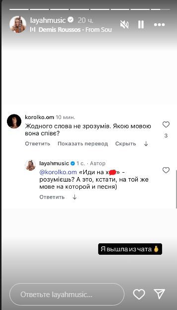 Сама ж Єва Бушміна хамовито сперечалась з коментаторами. Виконавиця послала "нах*й" тих, хто критикував її за російську мову.