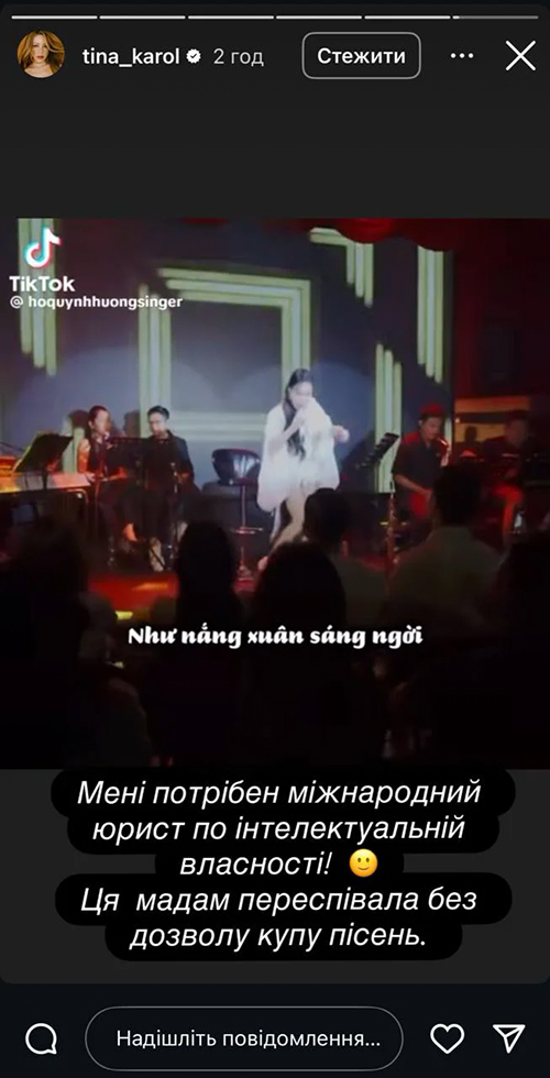 Вʼєтнамська співачка Хо Куїнь Хуонг без дозволу переклала пісні "Пупсік" Тіни Кароль і "Дикі танці" Руслани та видала їх за свої.