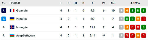 Україна набрала сім очок і посідає друге місце у відбірковій групі. Очолює квартет Франція (10), яка в паралельному матчі четвертого туру зіграла внічию з Ісландією (2:2).