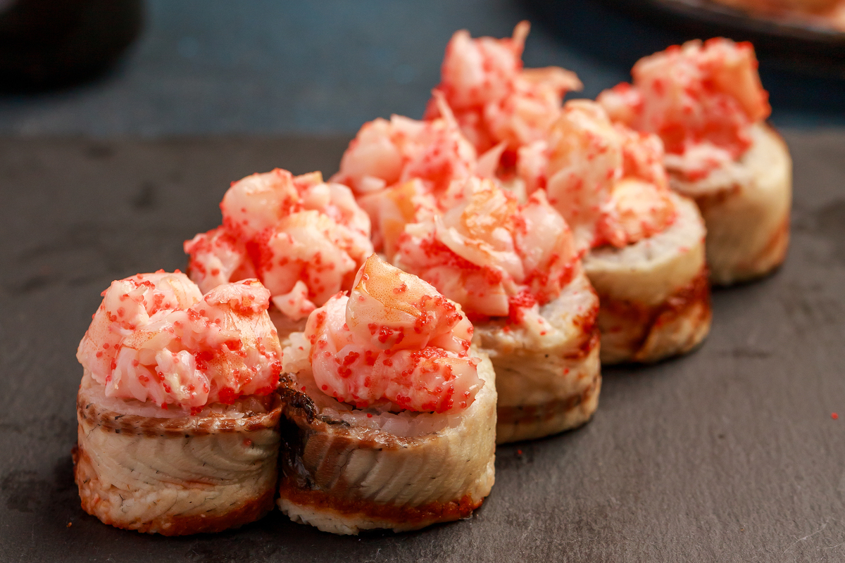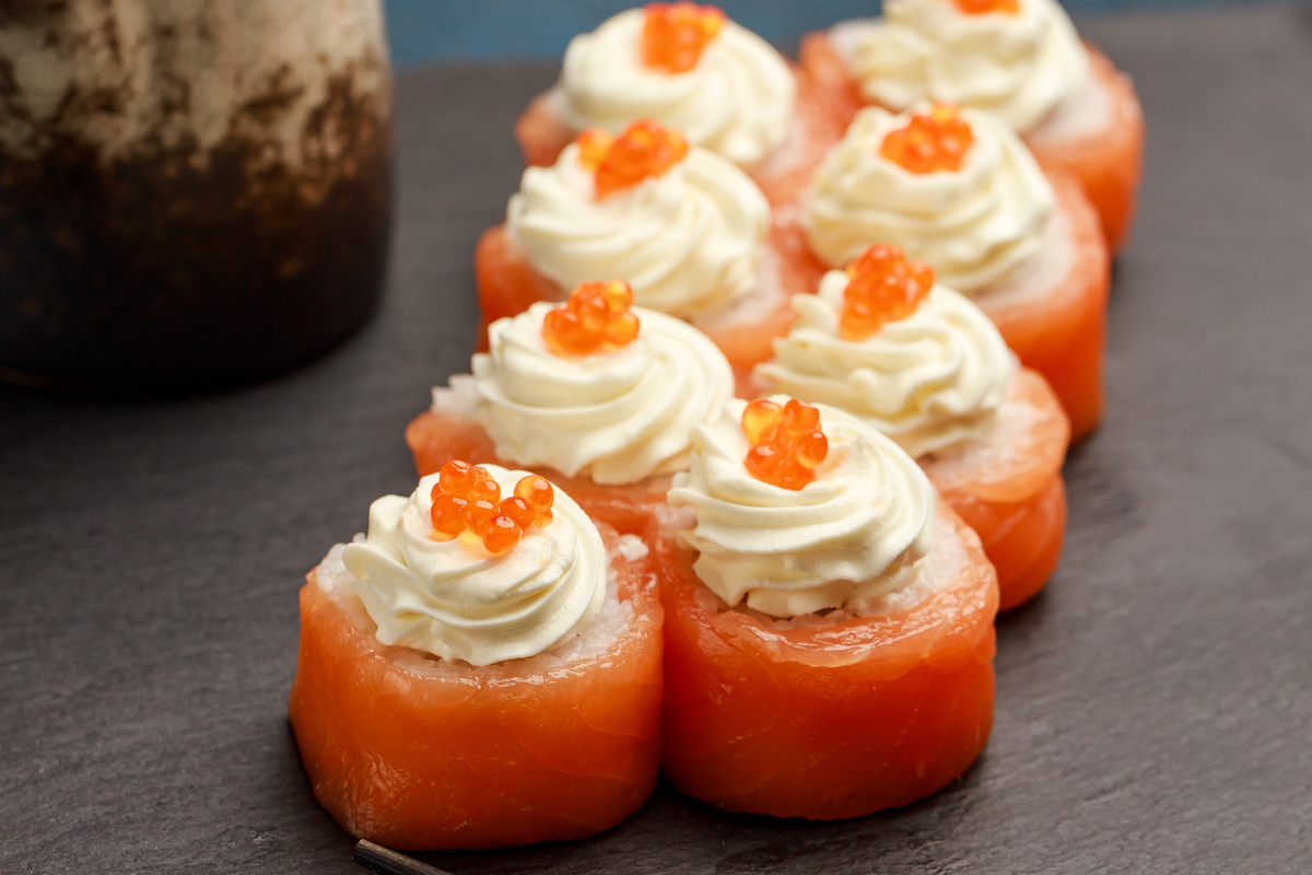 Різновид дарує вибух смаків для шанувальників кремових текстур. Класичний лосось поєднується з вершковим сиром філадельфія, свіжим огірком і авокадо, а зверху – шар ікри тобіко для хрусту. Цей рол вирізняється м'якістю та свіжістю: риба тане в роті, а сир додає вершкової насиченості без надмірної солодкості.