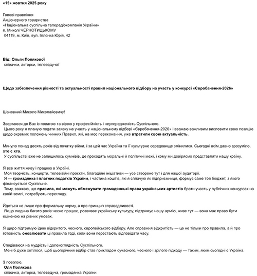 "Хочу поділитися з вами важливим кроком. Цього року я подаю заявку на участь у нацвідборі на «Євробачення-2026». І саме тому офіційно звернулася до Суспільного з листом про необхідність оновити окремі правила відбору.
