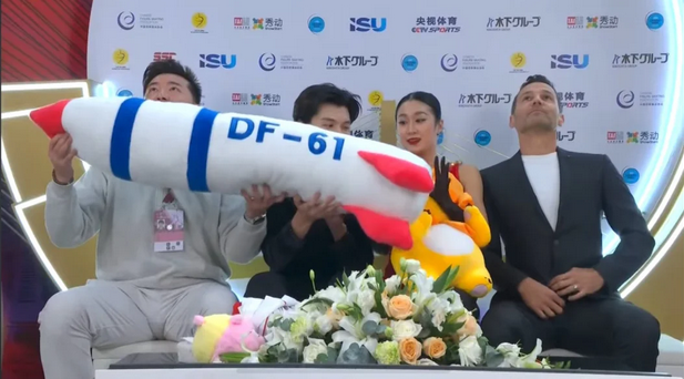 Під час очікування оцінок фігуристи Жень Цзюньфей і Сін Цзянін тримали в руках великий м’який предмет, схожий на ракету з написом DF-61, повідомляє AP, інформує UAINFO.org з посиланням на NV.