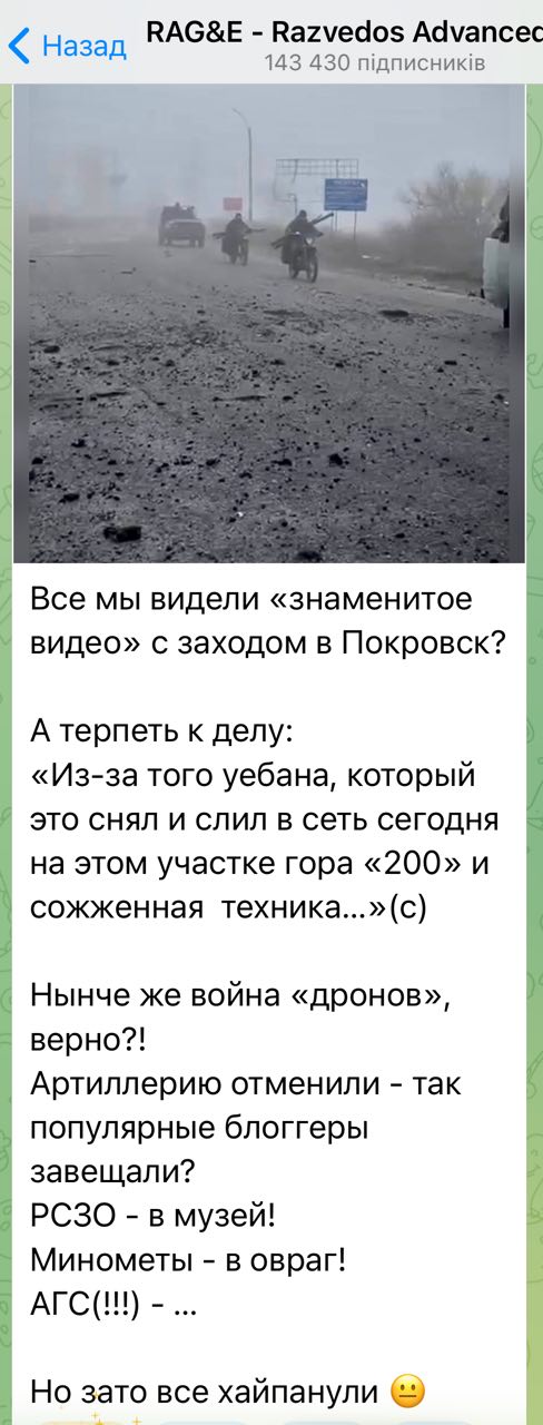 "Ведучий каналу "Соловйов Лайф" пропагандист і нацист Олександр Арутюнов (він же автор ТГ-каналу "Разведос") повідомляє, що якийсь російський у...н злив відео зі спробою заходу російських військ під прикриттям туману в Покровську Донецької області.