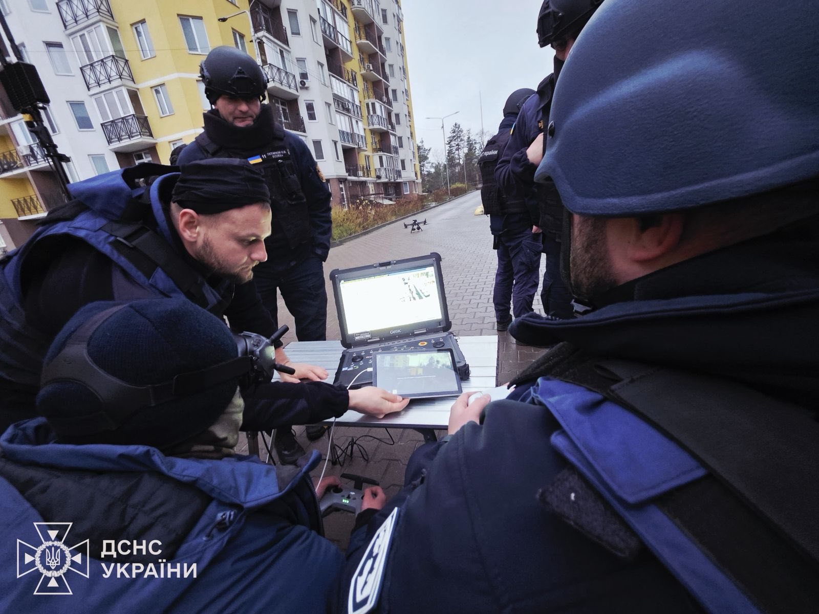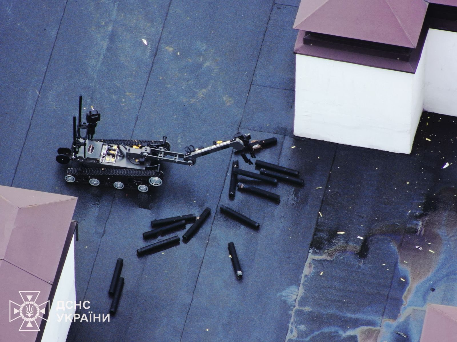 Щоб мінімізувати ризики, оператори роботизованих систем та БпЛА використали в тандемі дрони та багатофункціонального робота, зокрема і на даху будинку. Робот обережно зібрав усі вибухонебезпечні предмети у спеціальну ємність, яку потім за допомогою крану завантажили в піротехнічний автомобіль.