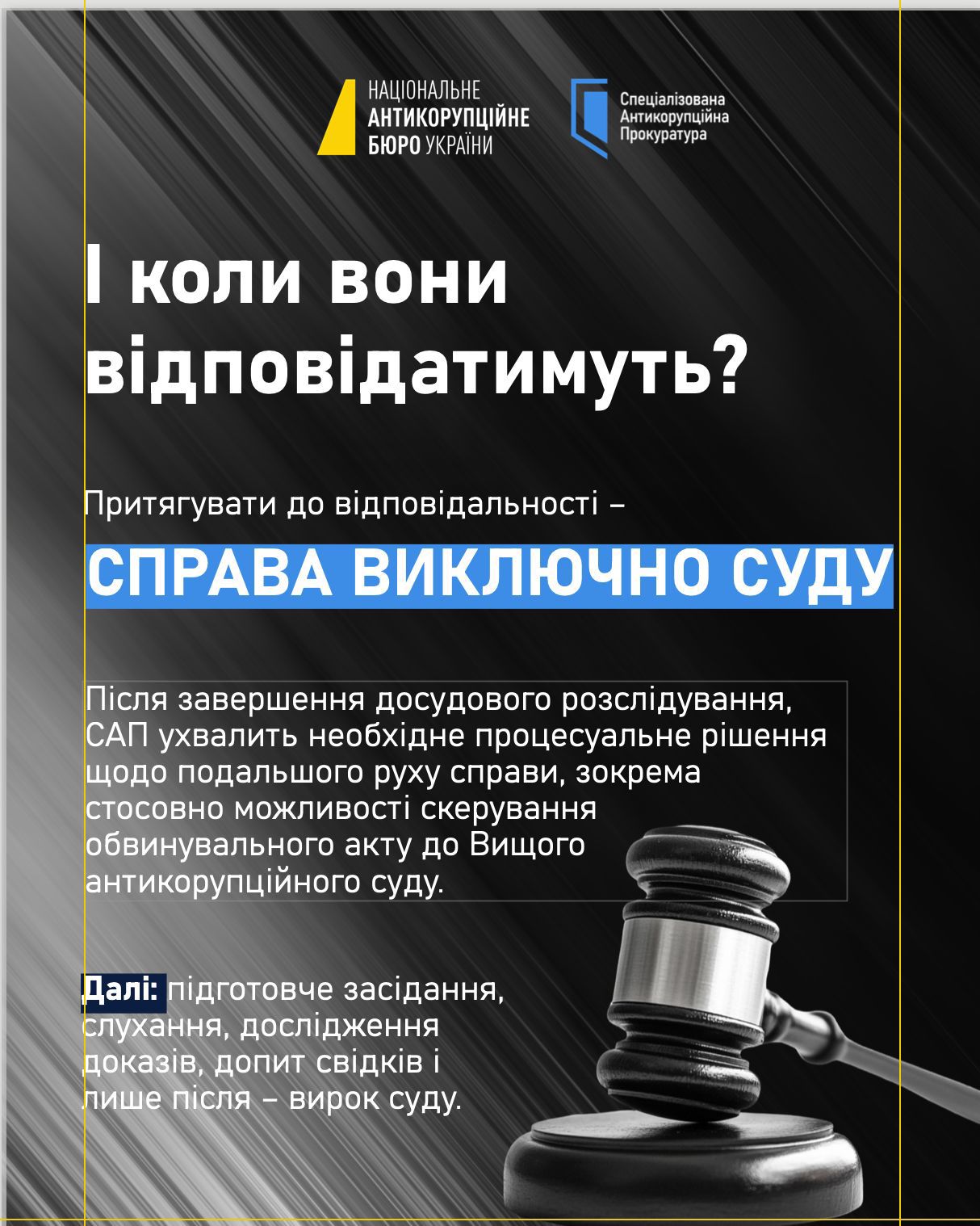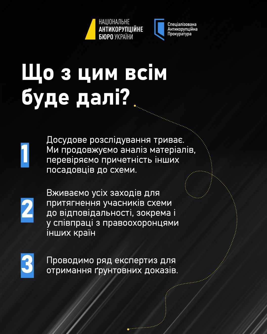 "Цифри, запобіжні заходи для фігурантів, механіка схеми, перспективи. Будьте антикорупційно свідомими й поширюйте лише перевірені факти", - зазначили в НАБУ.