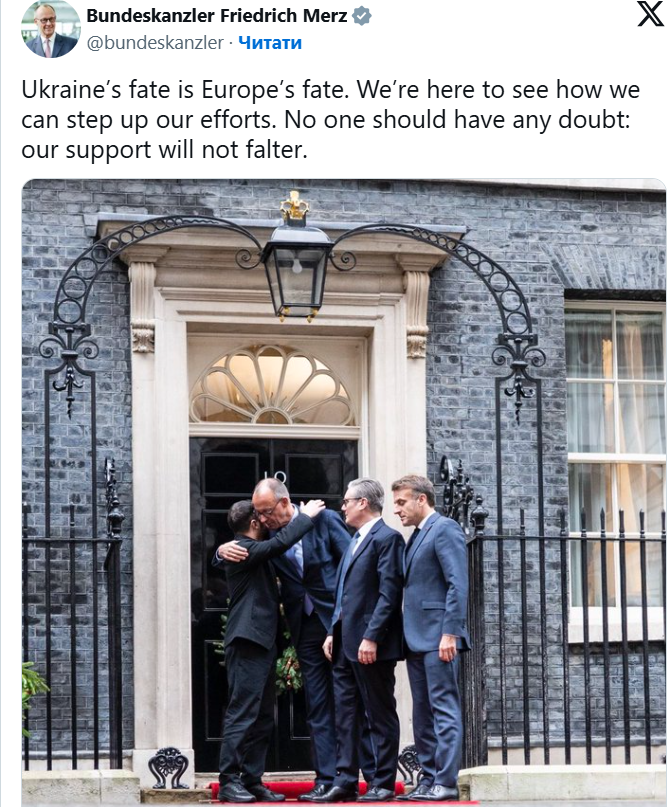 "Доля України – це доля Європи. Ми тут, щоб з’ясувати, як посилити наші зусилля. Ніхто не повинен мати сумнівів: наша підтримка не похитнеться", – написав Фрідріх Мерц після зустрічі.