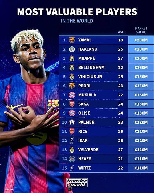Найдорожчими гравцями світу є вінгер "Барселони" Ламін Ямаль, нападники "Реала" Кіліан Мбаппе і "Манчестер Сіті" Ерлінг Голанд. Усіх трьох оцінюють у 200 млн євро, інформує UAINFO.org з посиланням на NV.