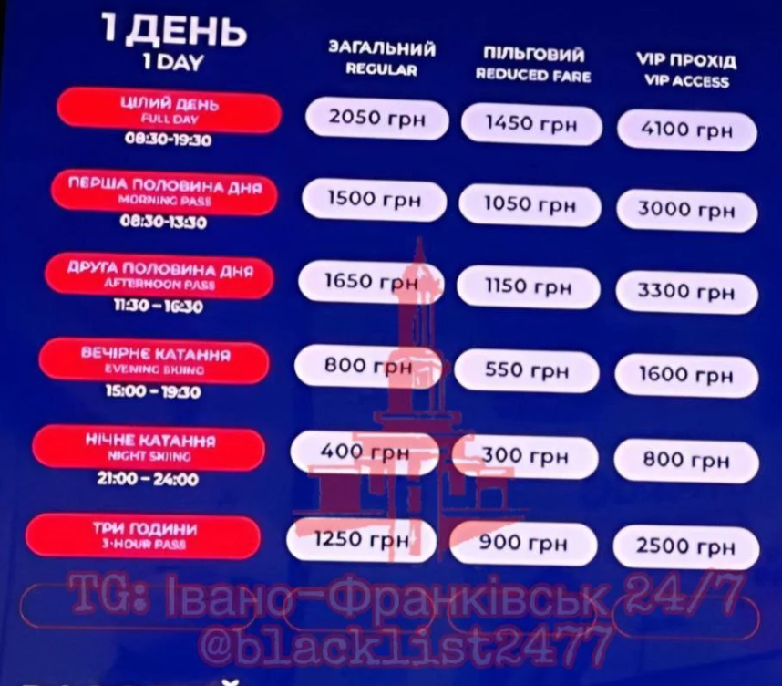 Вартість денного абонементу стартує від 2050 гривень, вечірнього — від 800 гривень, а разовий підйом (мультиліфт) обійдеться від 200 гривень.