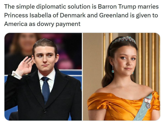 Зображення Баррона і Ізабелли поруч, підпис: “Просте дипломатичне рішення – весілля та передача Гренландії Америці” набрав понад 3 мільйони переглядів, 100 тисяч лайків і тисячі репостів.