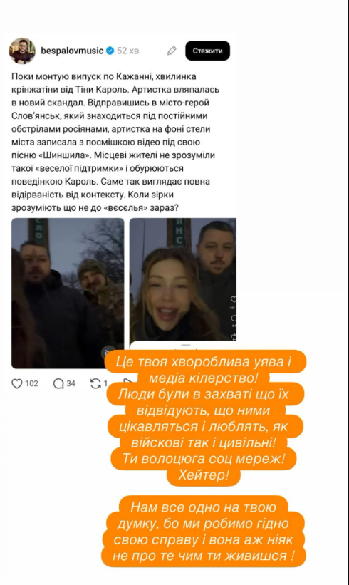 Тіна опублікувала скриншот цього допису на своїй Instagram-сторінці, звинувативши Беспалова у медіа-кілерстві. За словами співачки, жителі Слов'янська були лише раді її візиту.