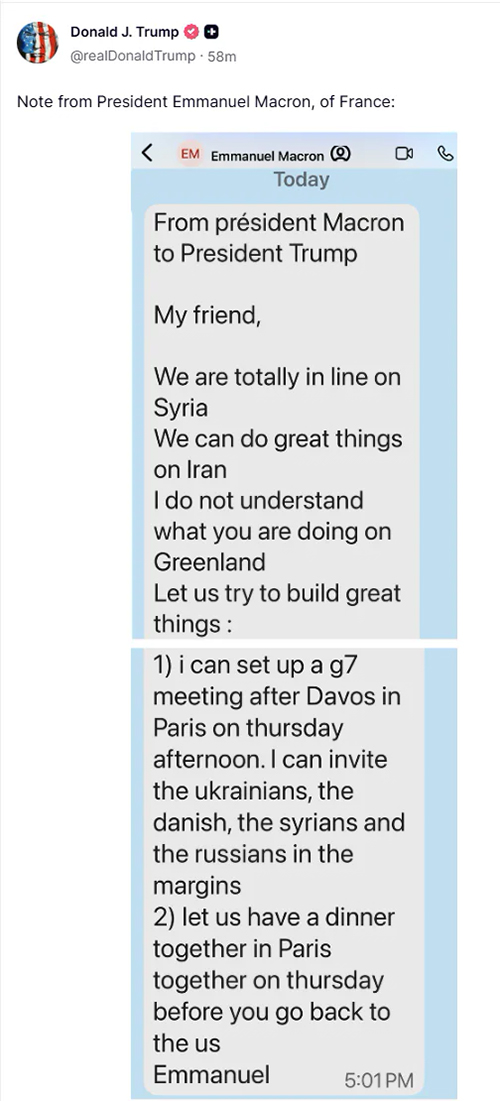Дональд Трамп 20 січня опублікував у мережу особисті повідомлення йому від президента Франції Емманюеля Макрона та генсека НАТО Марка Рютте, у яких йшлося про Гренландію.