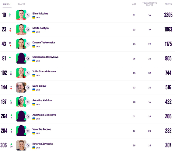 Марта Костюк втратила три позиції в списку, а Даяна Ястремська впала на 15 місць. Олександра Олійникова піднялася на одну сходинку, а Юлія Стародубцева наблизилася до сотні найкращих, поліпшивши своє місце в рейтингу на вісім позицій.
