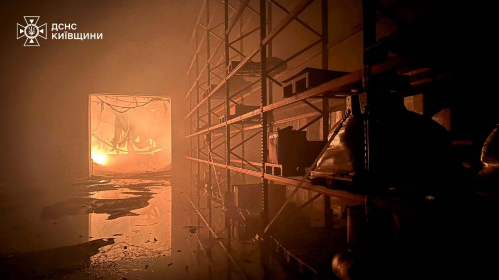 "Внаслідок нічної ворожої атаки дронів у місті Яготин Бориспільського району виникла пожежа на території складського комплексу", - йдеться в повідомленні.