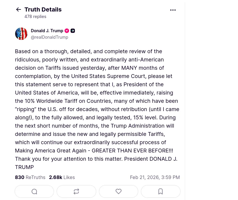 Президент США Дональд Трамп заявив, що підвищує глобальний тариф для всіх країн до 15% «ґрунтуючись на ретельному, детальному та повному розгляді абсурдного, погано написаного та надзвичайно антиамериканського рішення щодо тарифів, ухваленого вчора Верховним Судом Сполучених Штатів».