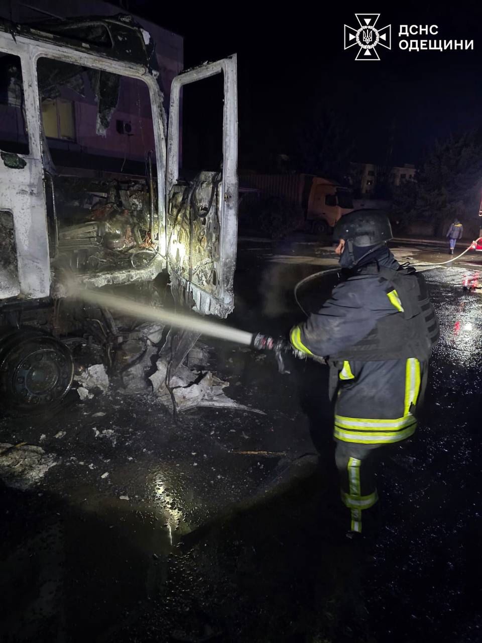 "За однією з адрес сталося падіння російського безпілотника. Горіли два вантажних автомобіля. Пошкоджено ще кілька транспортних засобів. Пошкоджено об'єкти інфраструктури.
