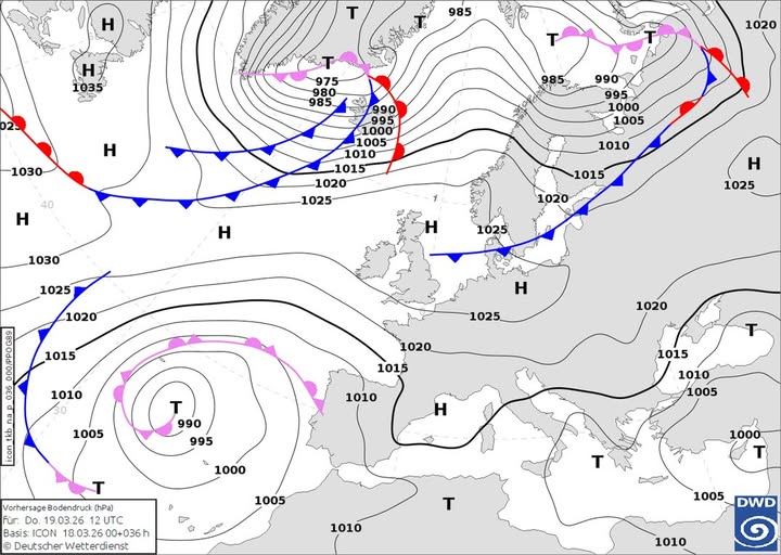 Ось на карті прогнозу на завтра, 19-го березня, видно, наприклад, холодний фронт (синя лінія із "колючками"), шматочки теплих фронтів (червона лінія із півсферами) і фронт оклюзії (бузковий колір із "колючками" та півсферами одночасно, над Атлантикою)", - завершила синоптикиня.