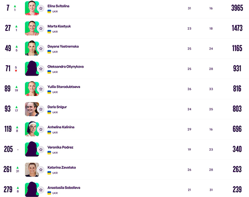 Марта Костюк покращила свою позицію на одну сходинку, тепер вона 27-а. Даяна Ястремська повернулася в топ-50 найкращих, піднявшись на п’ять місць.
