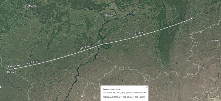 Фото: відстань між Єкатеринбургом та державним кордоном України за даними Google Maps