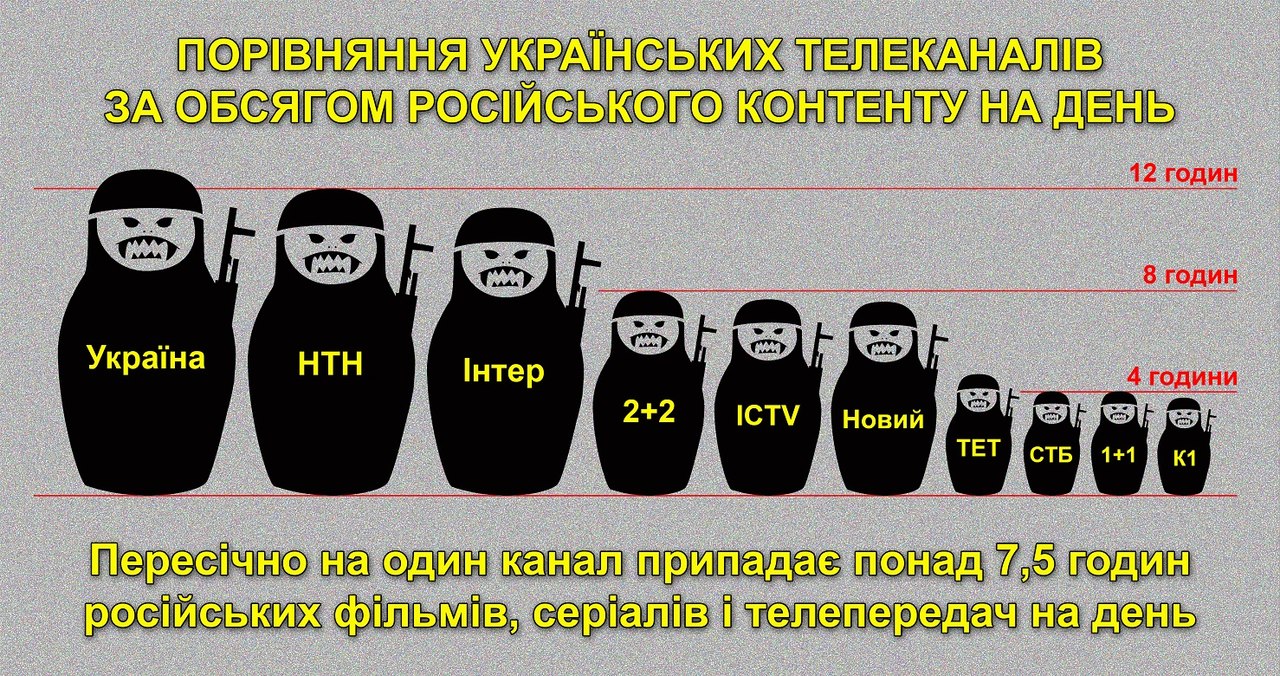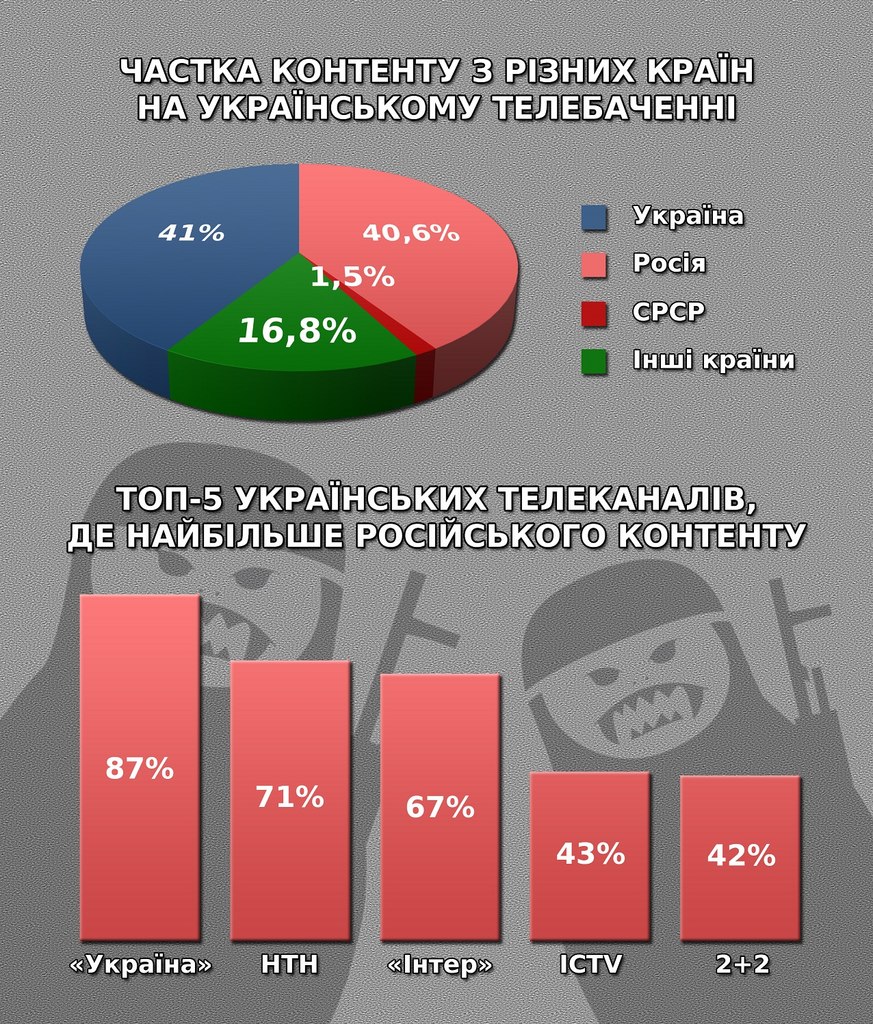 Активісти громадянського руху «Відсіч» у рамках ініціативи «Бойкот російського кіно»провели 17-годинний моніторинг десяти провідних українських телеканалів. Результати моніторингу свідчать, що частка російського контенту на українському ТБ перевищує 40% — це фактично дорівнює обсягам українського контенту та майже у 2,5 рази перевищує обсяги контенту з інших країн. Симптоматично, що найбільше російського контенту транслює телеканал із назвою «Україна» — 87% (!) від загального часу мовлення, пишуть ТЕКСТИ.