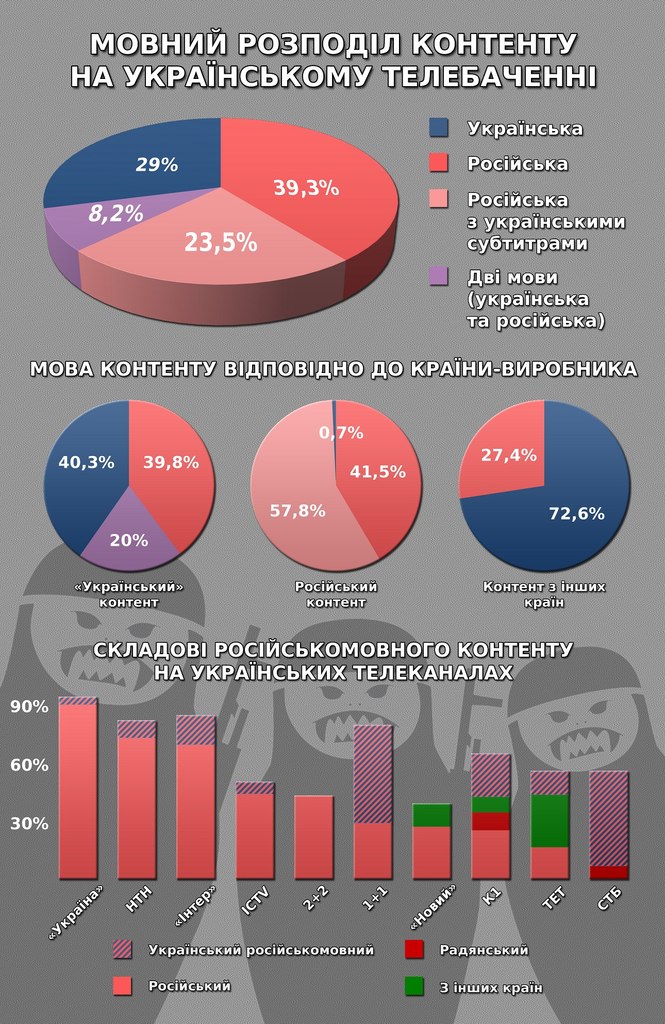Також активісти промоніторили мову українського телеефіру та дослідили телевізійний контент українського виробництва. Виявилось, що на українському телебаченні лише 29% україномовного контенту. Понад 60% свого мовлення українське ТБ провадить суто російською, і навіть далеко не завжди додає українські субтитри. На деяких каналах обсяги російськомовного контенту перевищують 90%.